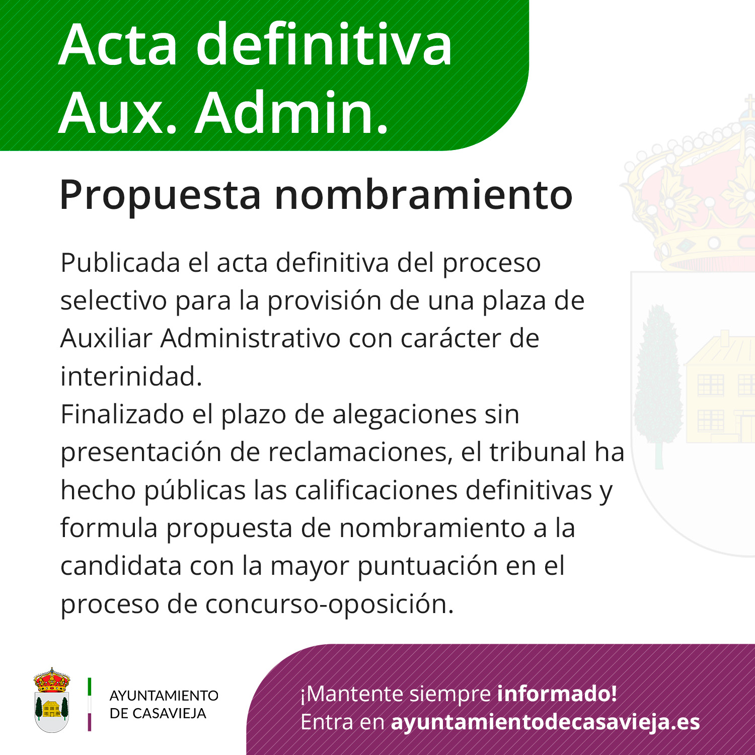 El Ayuntamiento de Casavieja publica el acta definitiva del tribunal correspondiente al proceso selectivo para la provisión de una plaza de Auxiliar Administrativo con carácter de interinidad, mediante el sistema de concurso-oposición.