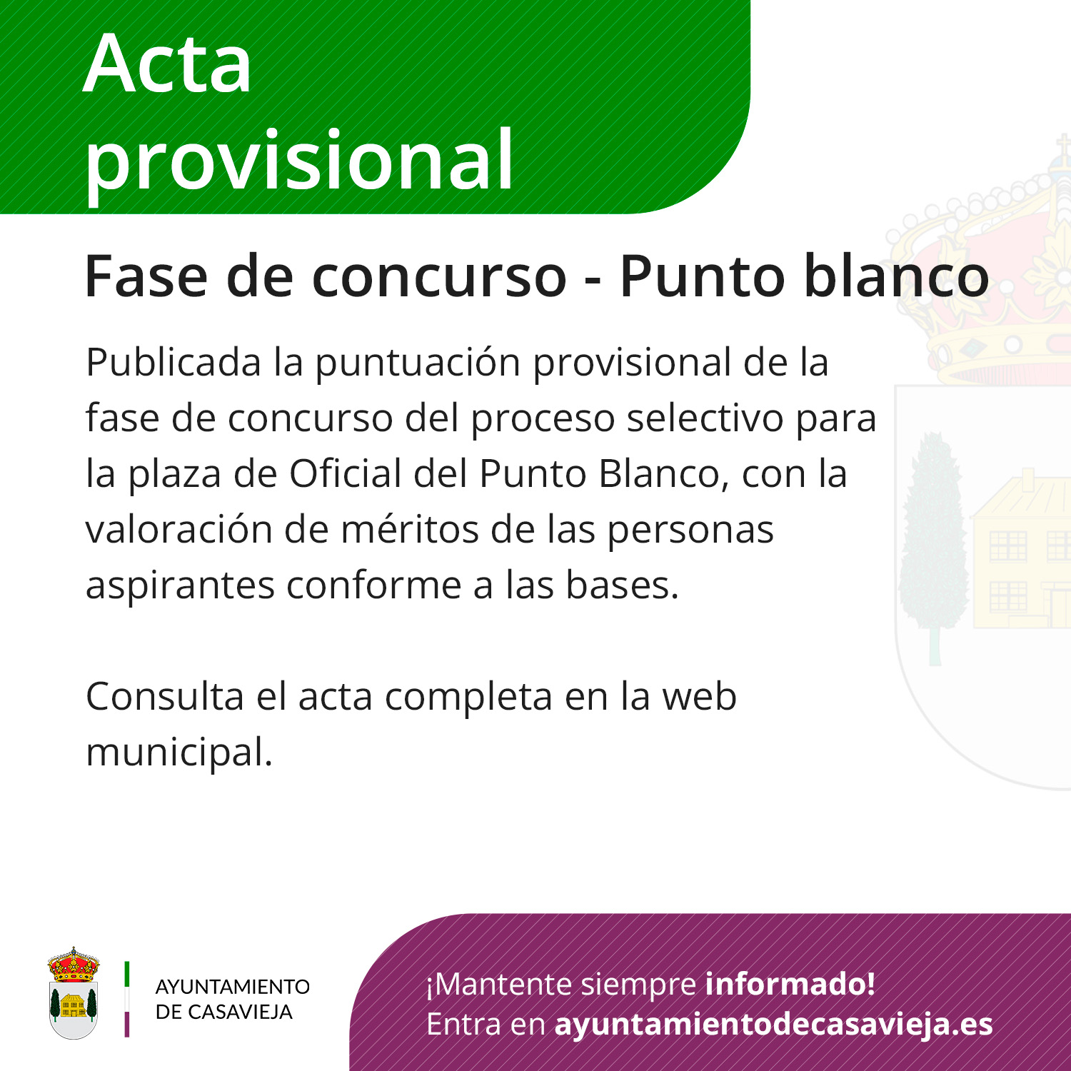 El Ayuntamiento de Casavieja publica el acta correspondiente a la puntuación provisional de la fase de concurso del proceso selectivo para la provisión de una plaza de Oficial del Punto Municipal de Residuos (Punto Blanco).