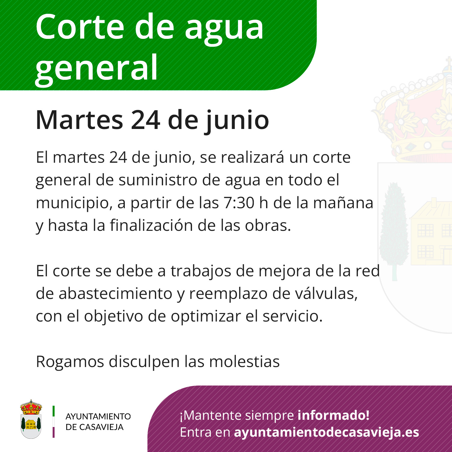 Se informa a todos los vecinos que mañana, martes 24 de junio, se realizará un corte general de suministro de agua en todo el municipio, a partir de las 7:30 h de la mañana y hasta la finalización de las obras.