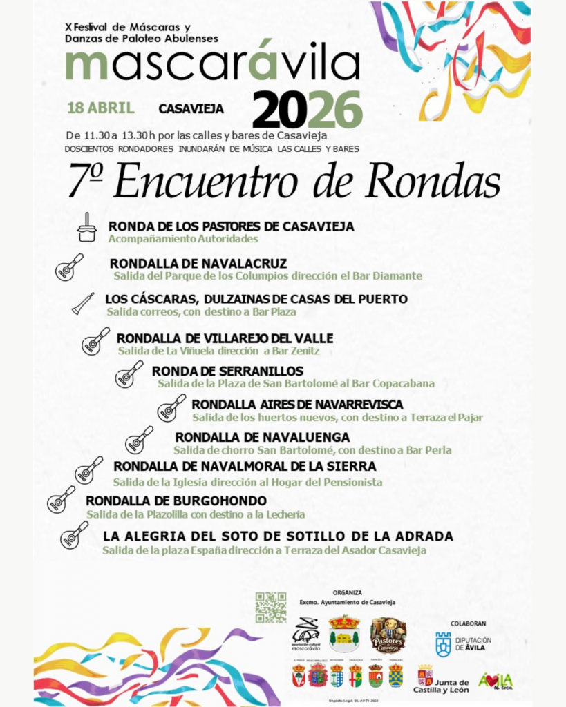 El próximo 18 de abril de 2026, Casavieja será el municipio anfitrión de Mascarávila, el gran encuentro de mascaradas tradicionales de la provincia de Ávila. Una jornada única en la que disfrutaremos de desfiles, música, folklore y las representaciones más emblemáticas de nuestras tradiciones ancestrales.