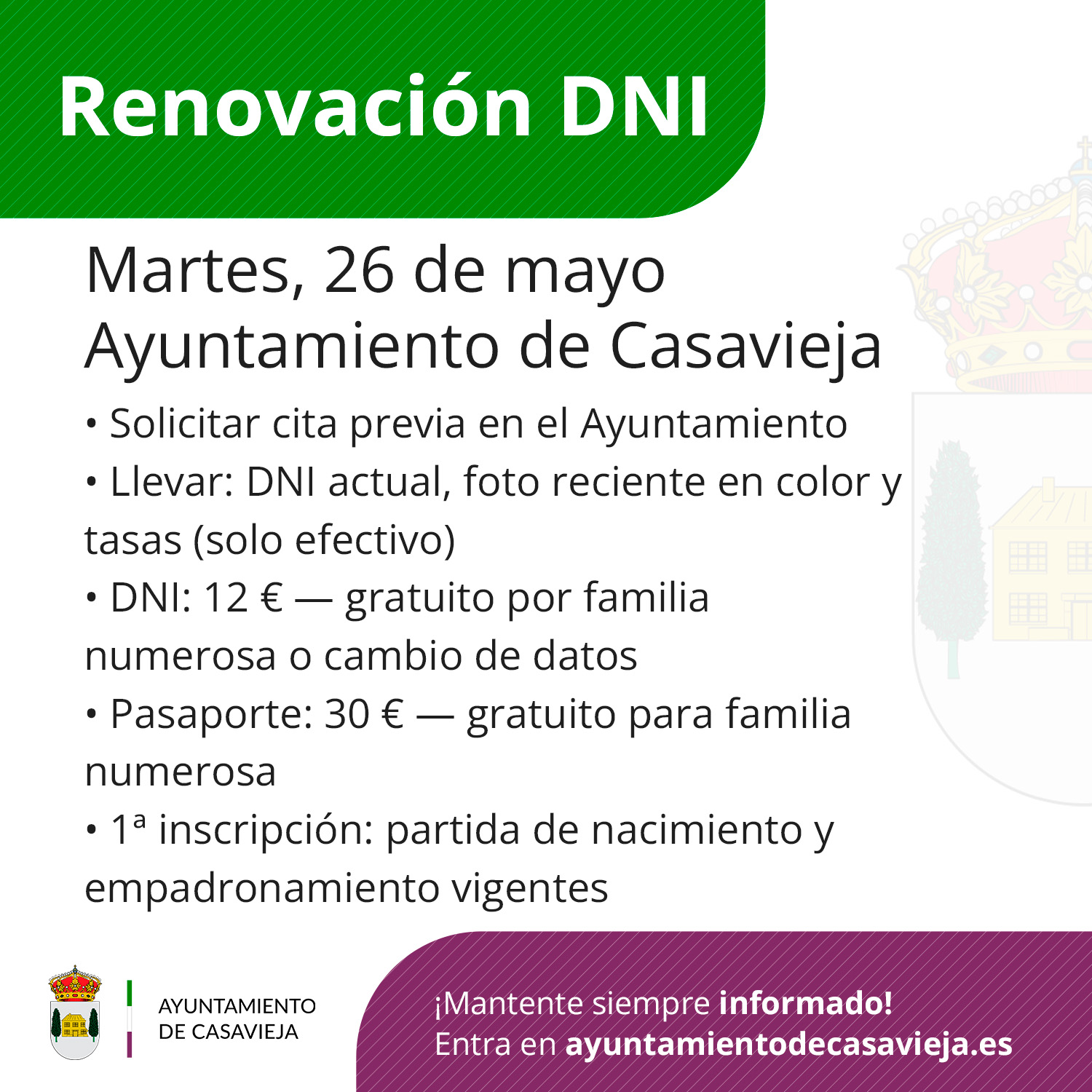 La renovación del DNI y Pasaporte requiere cita previa en el Ayuntamiento.