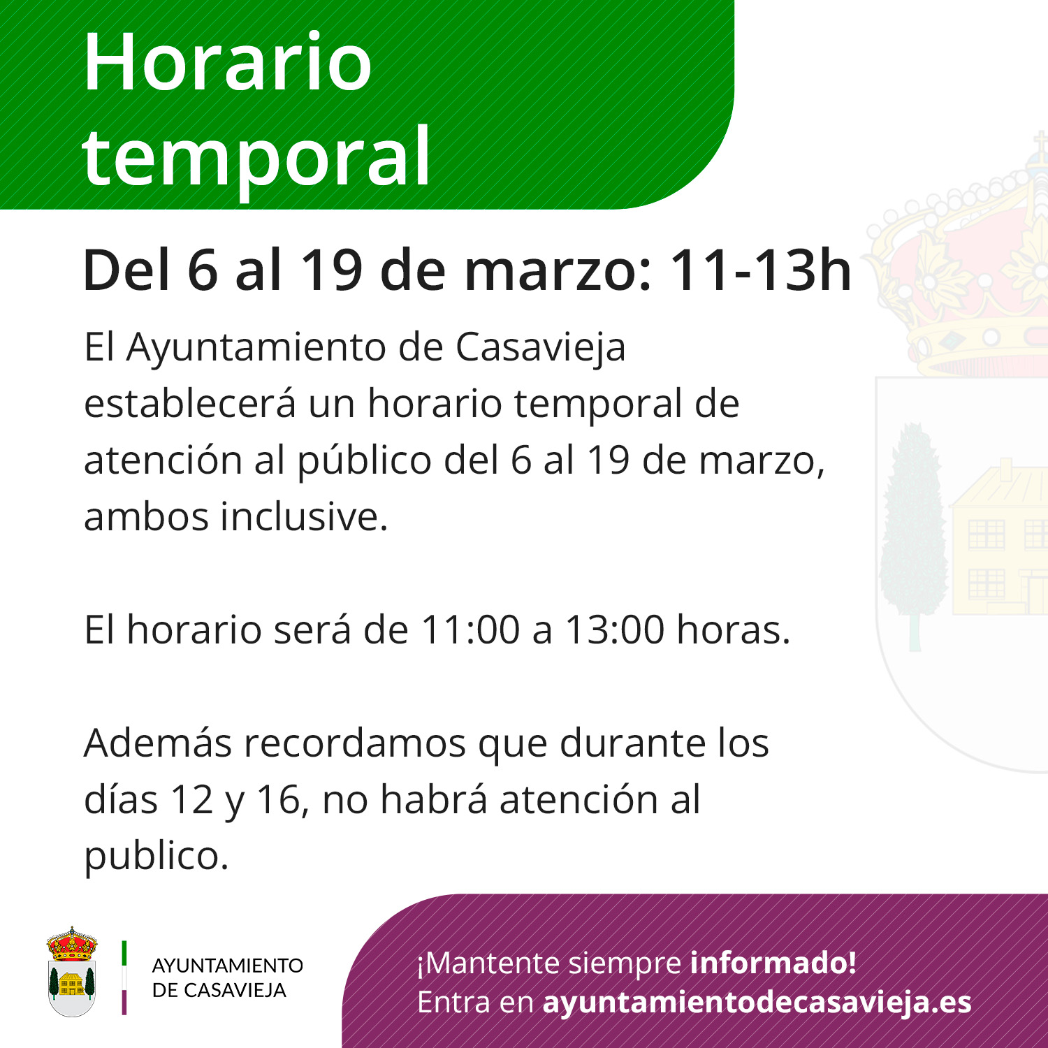 Se informa a la población de que el Ayuntamiento de Casavieja establecerá un horario temporal de atención al público del 6 al 19 de marzo, ambos inclusive.