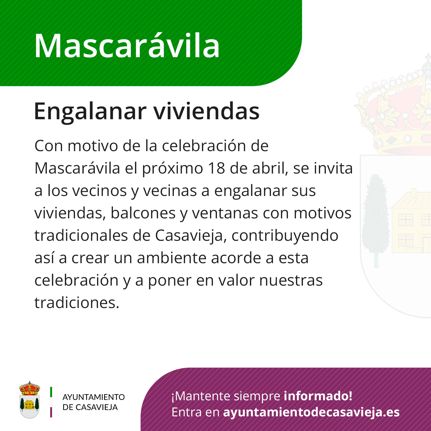 Con motivo de la celebración de Mascarávila, que tendrá lugar el próximo 18 de abril, se invita a los vecinos y vecinas a engalanar sus viviendas, balcones y ventanas con elementos y motivos tradicionales de Casavieja.