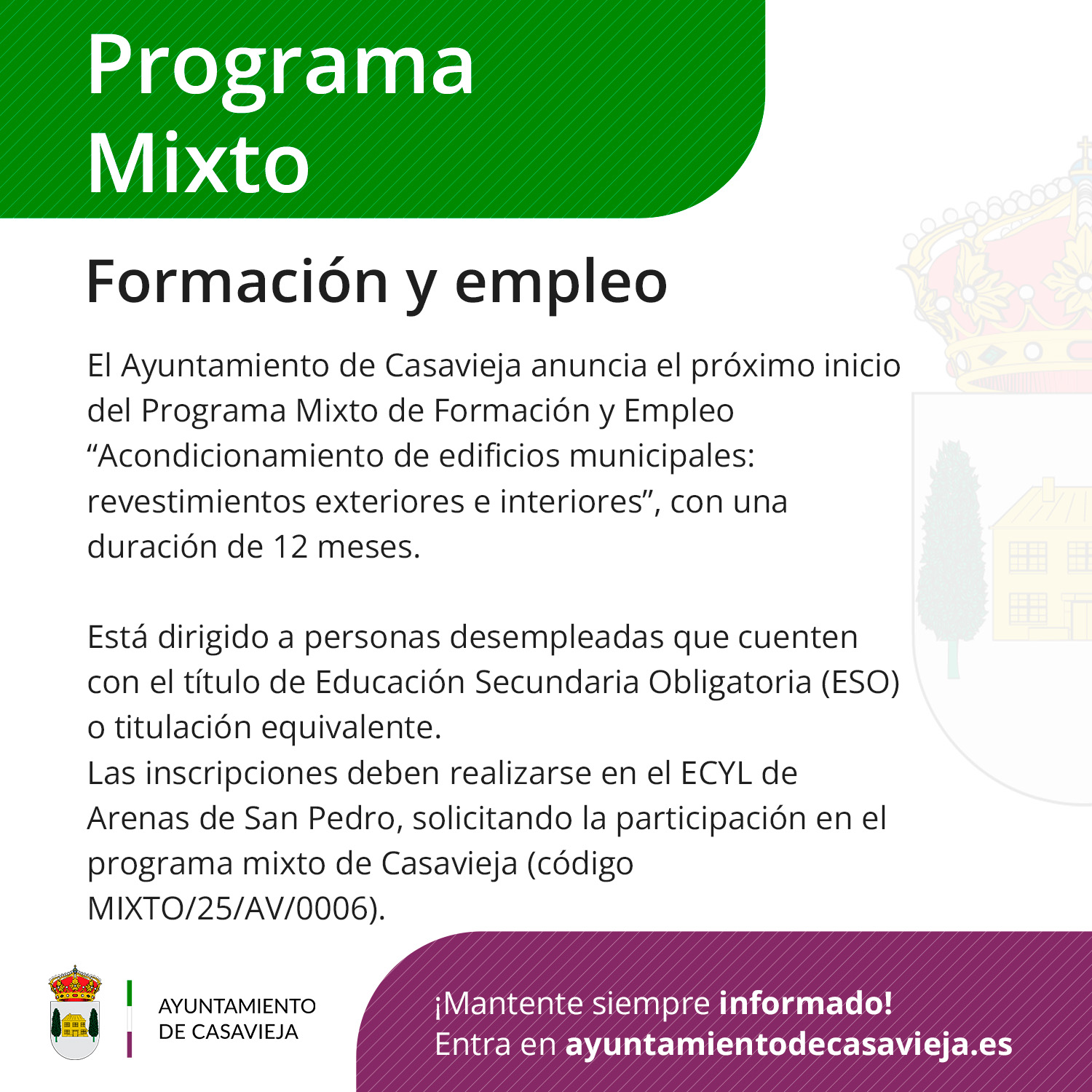 El Ayuntamiento de Casavieja anuncia el próximo inicio del Programa Mixto de Formación y Empleo de albañilería "Casa de la Madera", con una duración de 12 meses