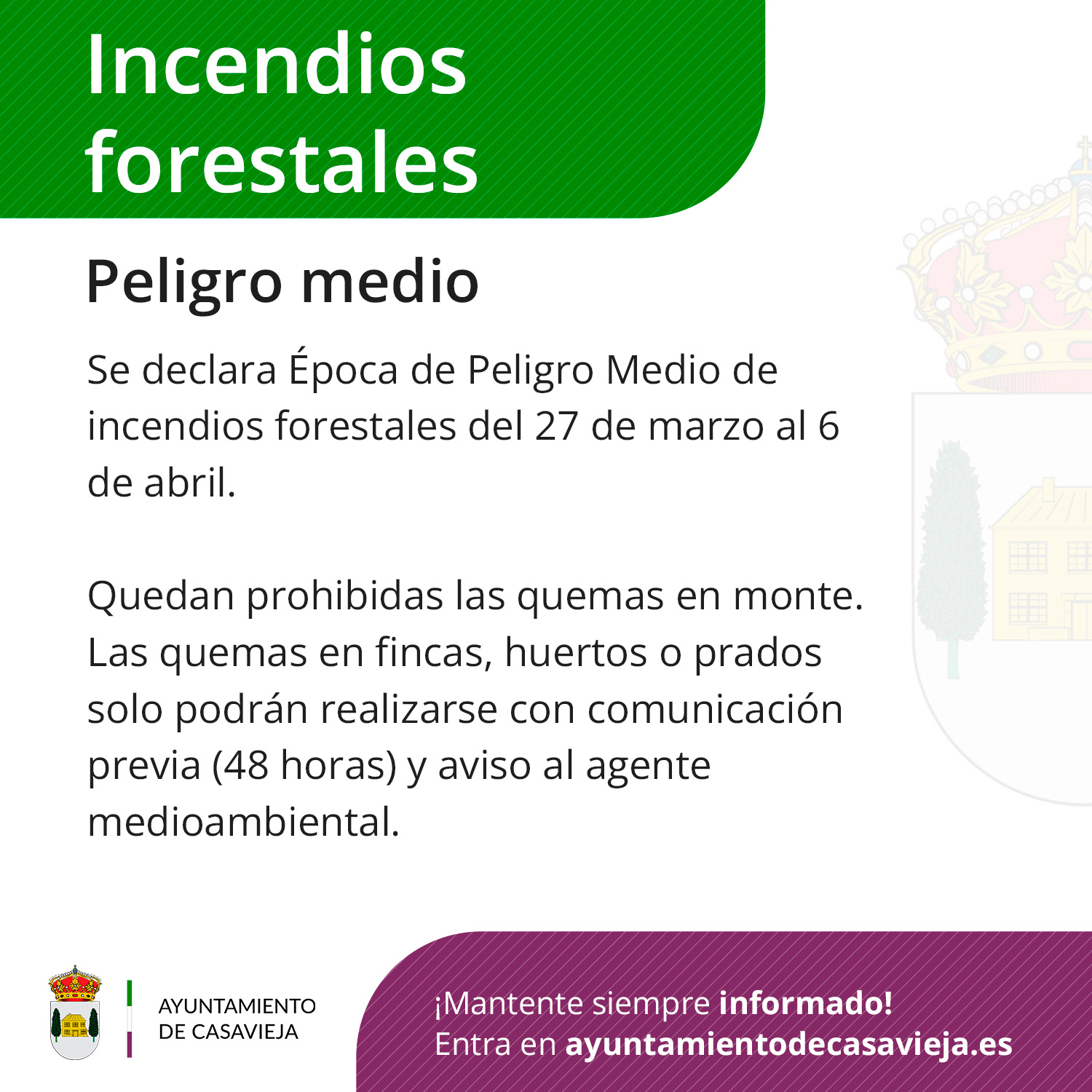 El Ayuntamiento de Casavieja informa de que la Junta de Castilla y León ha declarado la Época de Peligro Medio de incendios forestales en la Comunidad, establecida entre el 27 de marzo y el 6 de abril de 2026.