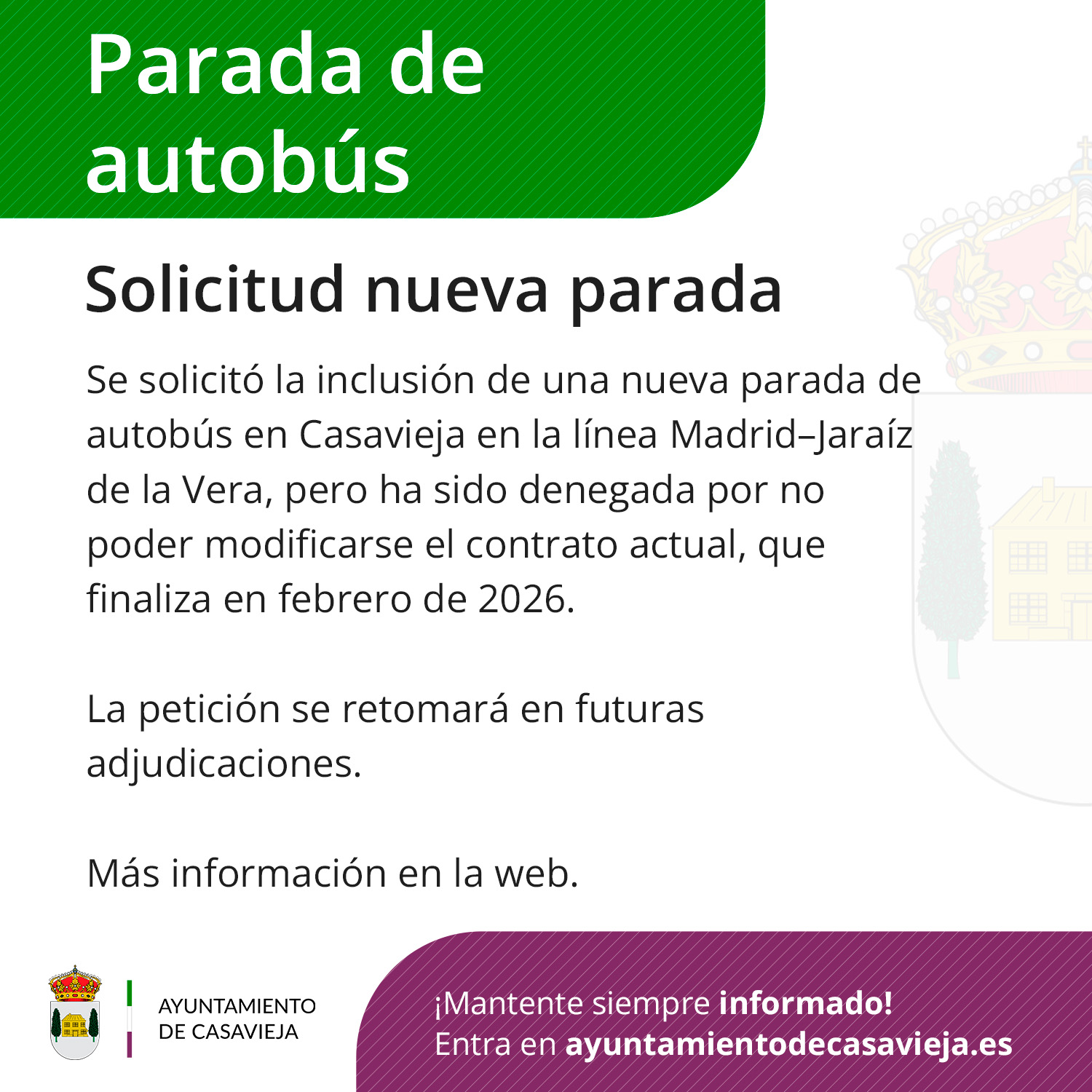 Desde el Ayuntamiento de Casavieja queremos informar a los vecinos de que, en su momento, solicitamos oficialmente la inclusión de una nueva parada en nuestra localidad dentro del servicio público de transporte entre Madrid y Jaraíz de la Vera (VAC-224), operado por la empresa La Veloz.